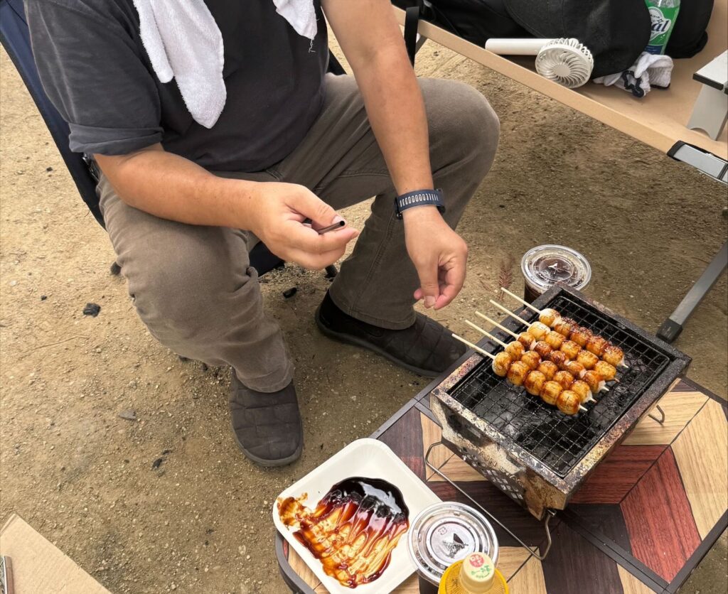 待ちに待った、デザートの時間。teddyをお団子焼き係に任命し、飲み物を調達しに行ったメンバーが戻ってきて目にしたものは…みたらし団子を上手に焼くみたらしおじさん!!