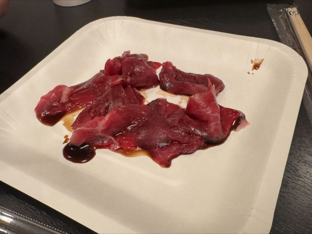 冷凍コーナーでゲットした特製タレ付き馬刺しも