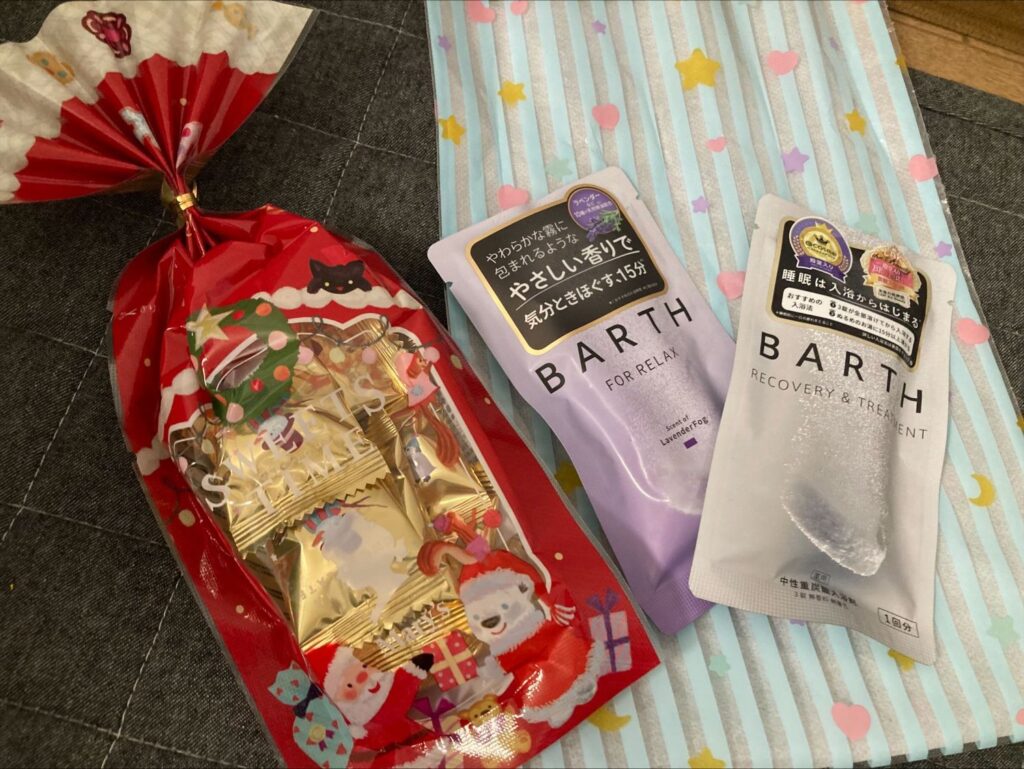 ひつじ姉さんからは、可愛いスノーマンの形をしたチョコレート。すずめちゃんからは、SNSで話題という疲れがとれるBARTHの入浴剤をいただきました。