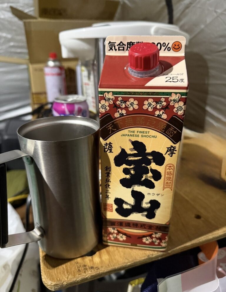 いざ、薩摩宝山のお湯割りタイム!お湯を注いだ瞬間から、テントの中は鹿児島の地に早替わり。
