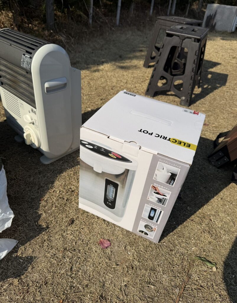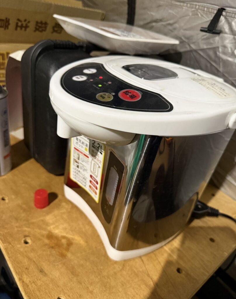 今回は試しに『電気ポット』を持参してみました。この電気ポットがあるキャンプ生活、驚くほど快適!でびっくり!