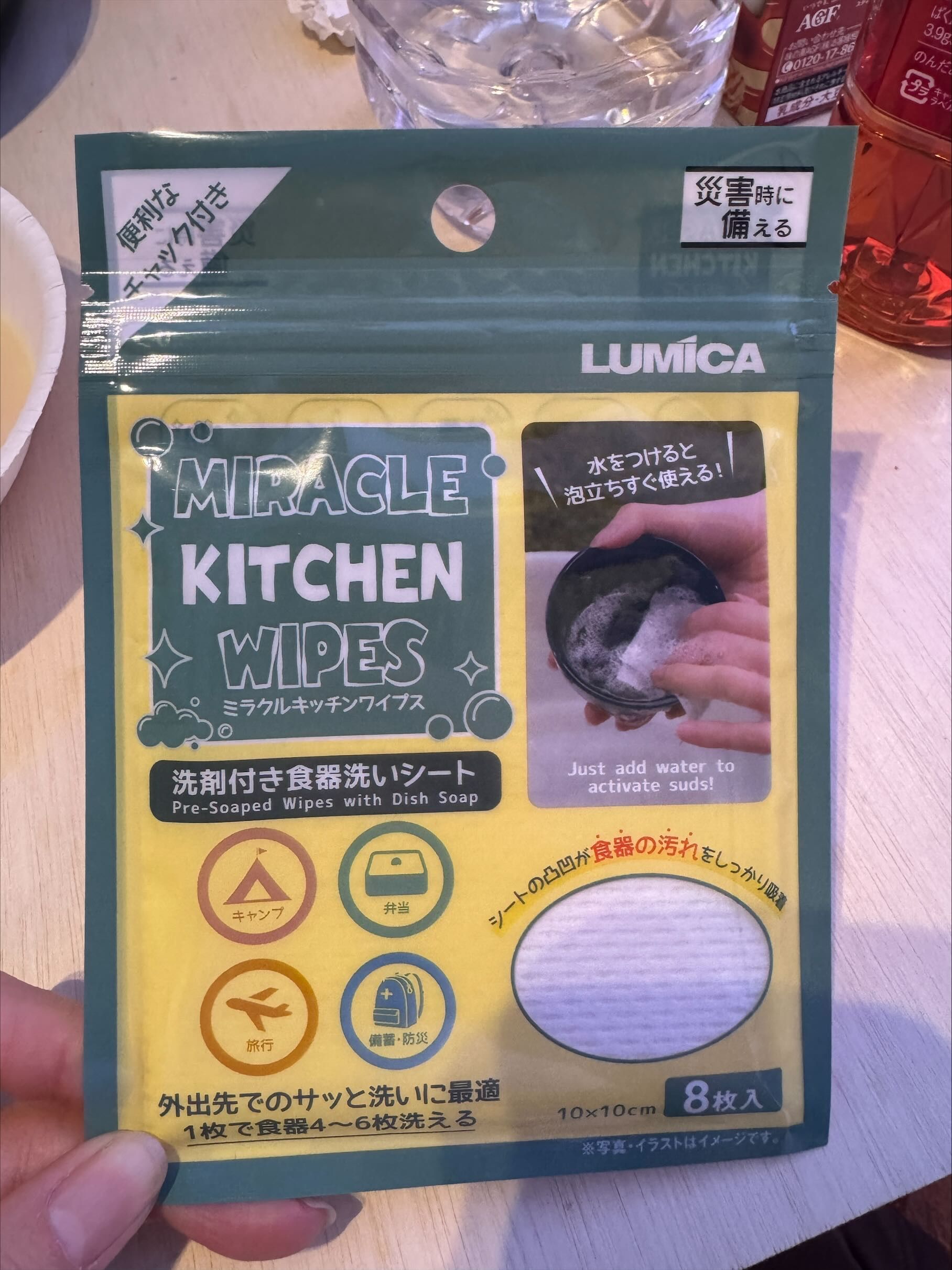 災害時、水が貴重なシーンでも、少量の水で汚れを落としてポイっと捨てられるのは大きなメリットです。キャンプで使いきれなくても、そのまま避難セットの中に入れておけば無駄になりません。
