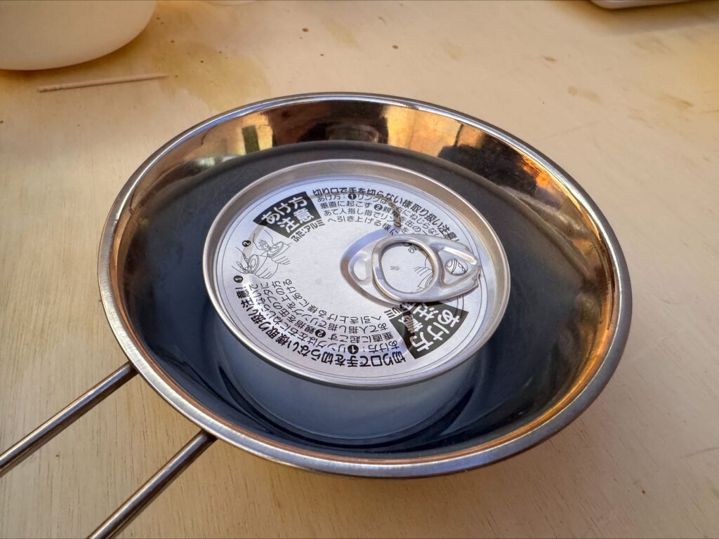 シーチキン缶ほどのコンパクトなサイズなので、ソロ用のクッカーにもすっぽり収まります。