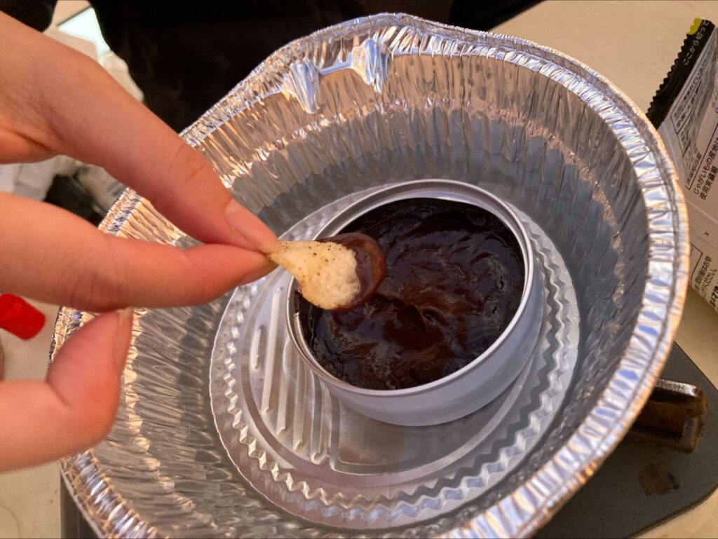 冬の屋外だとチョコがすぐ固まってしまうのが悩みですが、このソースは冷めても固まりにくいのが特徴。最後までとろとろの状態で楽しめるので、焚き火を囲みながらのまったりタイムに最適です。