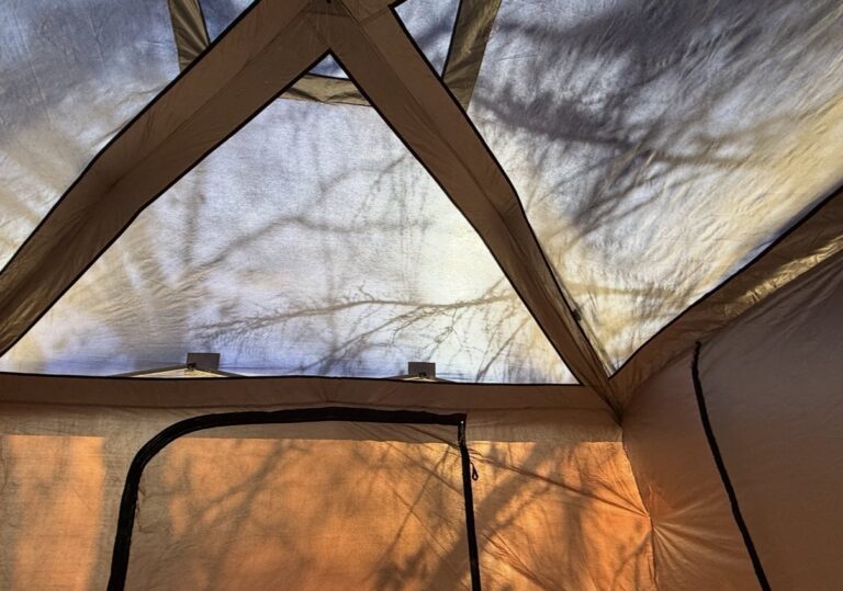 食後、ごろんと寝転んでタープを見上げると、春の陽ざしを受けた木々の影がふわりと映り込む。